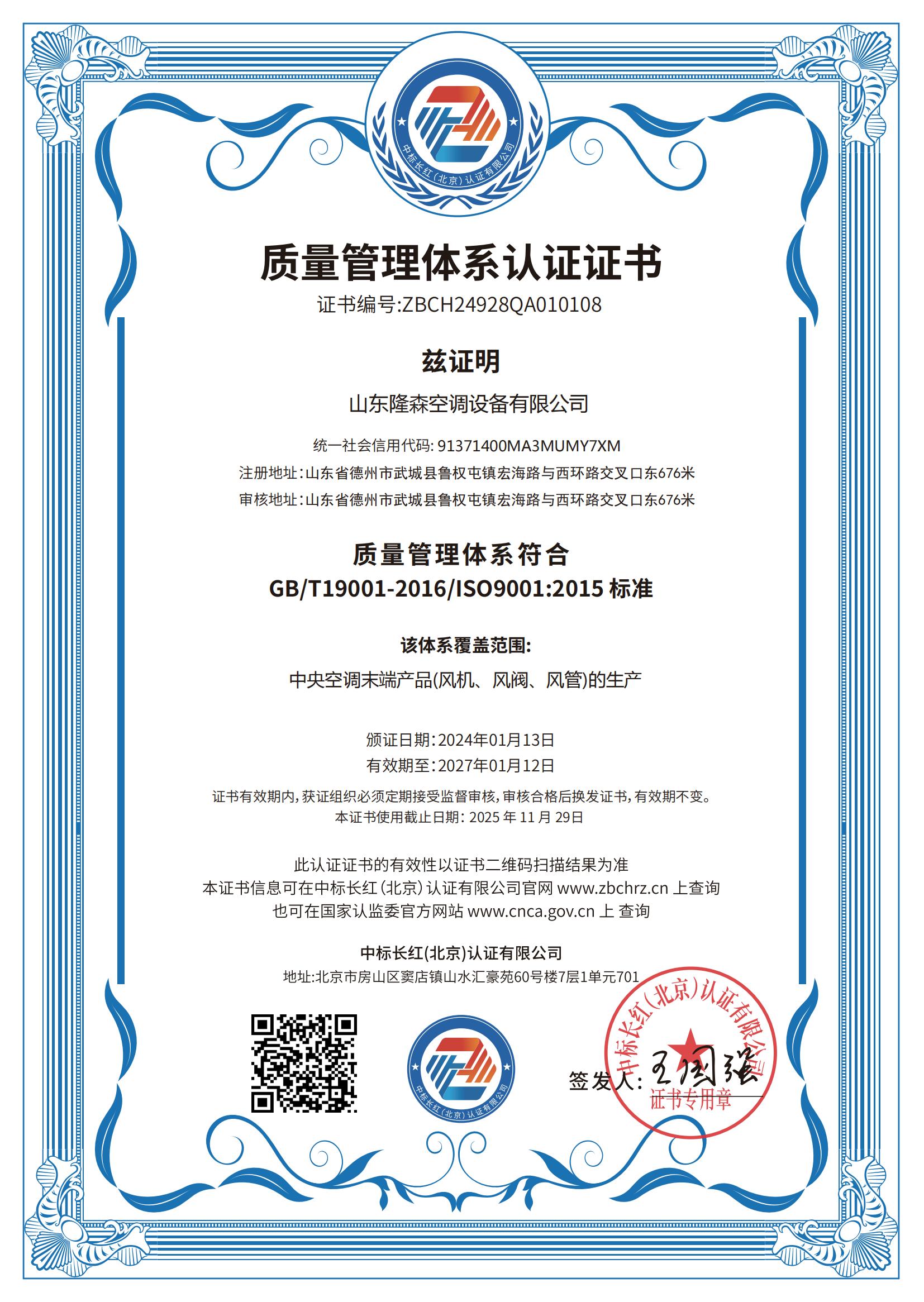 山東隆森空調設備有限公司座落于素有“九達天衢、神京門戶”美譽之稱的美麗德州,注冊資金1000萬,公司成立于2002年前身為山東明通通風空調設備加工廠。從事中央空調系統設備、通風設備、防排煙設備、玻璃鋼產品的制造、銷售、安裝及研發于一體的現代化企業。山東瀧森空調設備有限公司生產的產品主要有:排煙風機、消防排煙風機、離心風機、 新風換氣機、新風機組、凈化空調機組、醫用空調組合機組、螺桿機組、風冷機組、醫用凈化空調機組、吊頂式機組、轉輪式新風換氣機機組、風機盤管、排煙風機箱、混流風機、排煙防火閥......